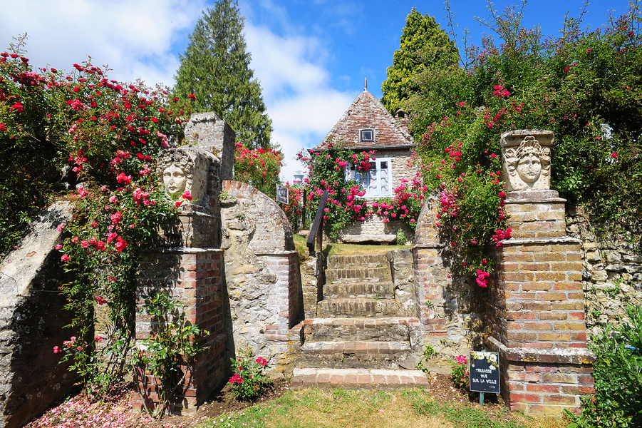 Para acceder a los jardines, tomar el carril Saint-Amand, y girar a la izquierda al nivel de la casa azul, que data de 1691. Después de pasar bajo la Tour-Porte, un camino bordeado por un lado por casas antiguas, por el otro por el muro de los jardines del Peintre, conduce a una pequeña puerta que se abre al final del jardín blanco, este es el nivel más bajo de los jardines. Matas de plantas blancas enmarcan un césped. Detrás, los espacios rodeados de arboledas forman tantos jardines independientes, conectados por caminos empinados que serpentean bajo los árboles. Suben a un jardín de rosas cuya terraza descansa sobre una sección de las ruinas del antiguo castillo. Junto al jardín de rosas, con parterres dibujados por cenefas de boj, un pequeño taller de verano recuerda que Henri le Sidaner solía hacer bocetos en el jardín, que luego finalizó en su taller de abajo. Luego, más arriba, una rotonda coronada con un mirador y una glorieta rodeada de glorietas. En todas partes de las camas, rosales corren por las paredes, a lo largo de los balcones que separan los jardines.