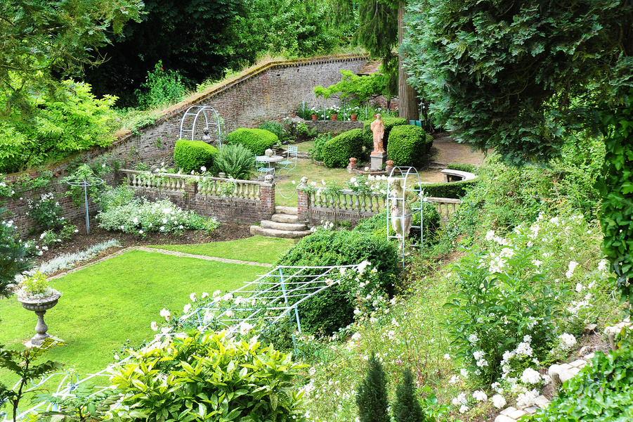 El diseño se organiza en 2 áreas principales: – la parte sur, instalada en un terreno plano, compuesto por 2 praderas, aproximadamente simétricos al eje central del marco. Esta zona es bastante abierta y florida. Un pequeño estanque de orillas sinuosas, adornado con abedules llorones y una magnolia Soulangeana. A lo largo de la pared, una colección de plantas perennes que cubre más de 1000 m². Los invernaderos se distribuyen por el sur, así como un antiguo depósito de agua. – la parte norte, instalada en el borde de la pendiente, organizada alrededor de una gran masa de agua. Esta zona está muy plantada y es más natural. El marco se coloca en la rotura del talud, escenificado por la excavación de un trozo de agua atravesado por un puente. The Carmel Gardens: un antiguo huerto, ahora accesible como parque público, linda con el parque municipal de Emonville. Abrigado por muros de 3 m de altura, fue una antigua cervecería y un huerto del que se conservan algunos ejemplares del siglo XIX y palmetas, espalderas, cuerdas y contra espalderas adosadas a los muros. Sin duda, se habilitó al mismo tiempo un paseo sombreado, adornado con una pequeña pérgola con un rosal. Una cuadrícula permite pasar del huerto al huerto. La antigua huerta, dividida en seis plazas rectangulares, rodeada de callejones con cenefa de boj. Se encuentra un claustro central adornado con un prunus púrpura y tejo. Una pequeña cuenca de recogida de agua de lluvia se ha mejorado con hierbas ornamentales.