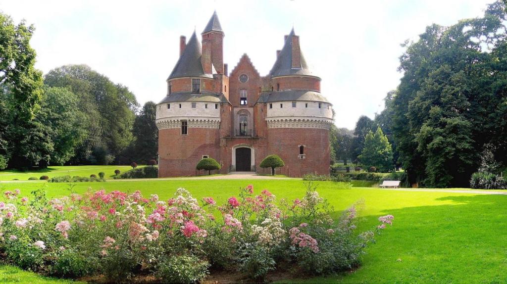 Los orígenes de la actual finca se remontan a mediados del siglo XIV, estando las construcciones anteriores situadas en la mota feudal de enfrente, rue de la grande mare. El entorno del castillo de ladrillo y piedra del siglo XV, con curvas sorprendentes, debía presentar en su momento una fuerte forestación, un medio natural de defensa plantado por un lado de forma hábil para desviar las bolas y evitar la perforación de savia y, por otro lado, permitir que la madera sea utilizada para reparaciones, carros de armas, uso de la ceniza que se utilizó en la composición de la pólvora, etc.