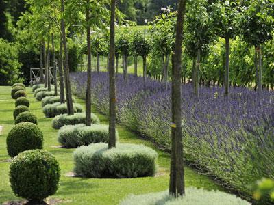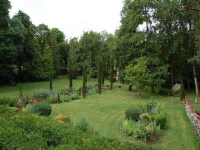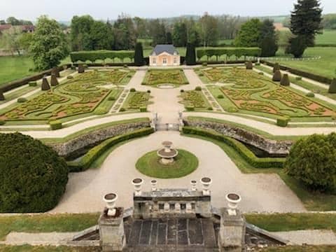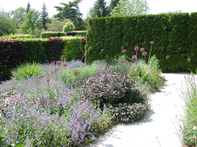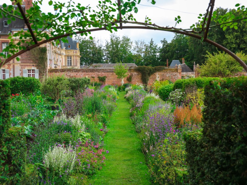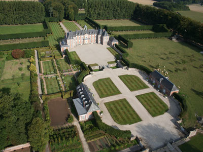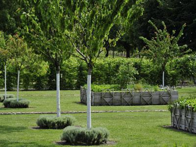 Parque rodeado por una doble hilera de hayas centenarias. Céspedes con tejos y boj cortado. Charmilles. Huerta florecida en colores asociados. Jardines secretos. Fronteras perennes. Árboles frutales podados contra espalderas, copas, cordeles