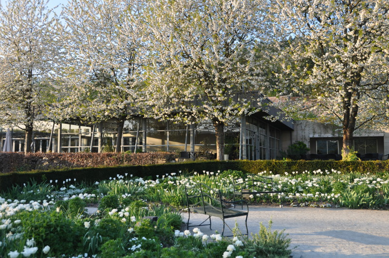 En el centro del patio, una inmensa alfombra de césped verde, secuenciada con senderos peatonales, está bordeada por fragantes plantas arbustivas. Es el jardín de los aromas. Al abrigo del viento, desprenden diferentes aromas durante la floración según la hora del día. Los invernaderos del noroeste albergan, entre otras cosas, una importante colección de ficus y una colección de fragantes pelargonios. 600 m² están dedicados a cactus y suculentas de Sudáfrica, Canarias y México. Con más de 260 taxones de begonias, magníficas orquídeas, numerosas Peperomia y varias Bromelias, las colecciones presentadas en los invernaderos del suroeste ofrecen una notable diversidad de formas y colores. Los invernaderos del sureste presentan al público todo el saber hacer de los empleados del Departamento de Espacios Verdes.