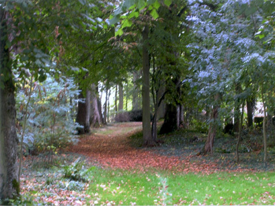 – Desde la entrada a las dependencias hasta el patio principal: tilos, tejos a la italiana, hayas bicentenarias, rosales anticuados, senderos bordeados de frondosas variadas, siempreverdes y coníferas.