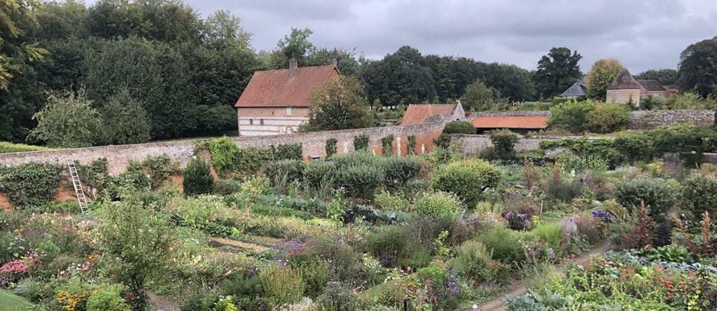 Entre en el escenario formado por los muros del huerto y admire cada una de las rosas, peonías … Cerrado por muros de ladrillo naranja de Varengeville, este huerto linda con el castillo.