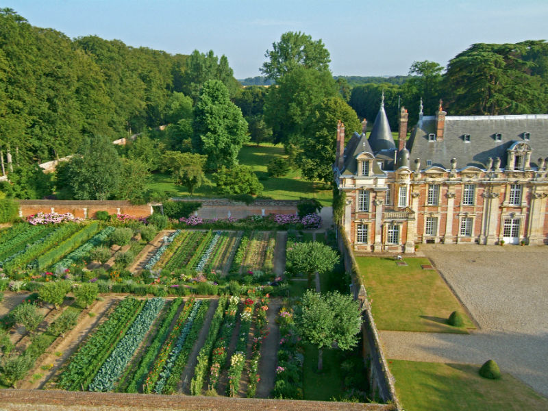 En esta transformación, se ha conservado el invernadero de naranjos, del siglo XVIII, así como la galería subterránea de mampostería que canaliza el agua de la Fuente de St Evroult. Los altos muros que rodeaban el huerto se bajaron, pero no se nivelaron; así, desde el jardín francés, la mirada puede escaparse al campo circundante, pero a la inversa, el jardín francés sólo puede descubrirse al final de una ruta que conduce al castillo, como una joya de arte en la naturaleza. La unidad clásica de este sitio es tanto más notable cuanto que su realización tardó más de un siglo: desde la parte central del castillo, a finales del siglo XVIII, hasta la creación del jardín francés, hacia 1925.