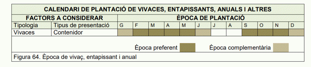 Las vivaces en general se pueden plantar prácticamente en cualquier época del año, evitando los días más fríos y cálidos del año, aunque es preferible durante los meses de otoño y primavera, para evitar pérdidas y marras innecesarias durante el tiempo de implantación. En general, es deseable evitar la plantación del 15 de junio al 15 de agosto, excepto algunas especies tropicales o subtropicales que puedan estar adaptadas a las condiciones de Barcelona, tal como se especifica en la tabla correspondiente.