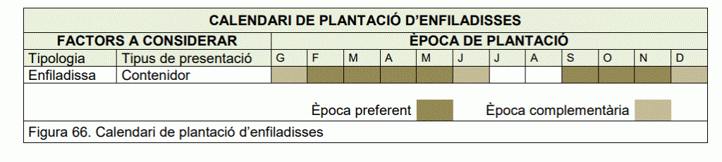 Es preferible plantar enredaderas durante los meses de otoño y primavera, aunque se pueden plantar en cualquier época del año, evitando los días más fríos y cálidos del año, para evitar pérdidas y marras innecesarias durante el tiempo de implantación. En general, es deseable evitar la plantación del 15 de junio al 15 de agosto, excepto algunas especies tropicales o subtropicales que puedan estar adaptadas a las condiciones de Barcelona, tal como se especifica en la tabla correspondiente.