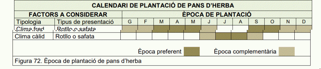 El pan de hierba es un césped precultivado que se presenta en rollos o bandejas. La implantación se puede realizar durante casi todo el año, según el tipo de césped a emplear. Para mezclas de clima templado y frío, se puede realizar de marzo a diciembre, preferentemente en primavera y en otoño; por mezclas de clima cálido, se puede hacer de mediados de junio a mediados de septiembre. En general, si se ha de realizarla en verano, se deben extremar las medidas de protección en el transporte, la implantación, el mantenimiento y en el riego. PiJBIM no se hará cargo de los céspedes plantadas bajo estas condiciones hasta que no verifique su buen estado. La implantación de céspedes con tepes se llevará a cabo en ausencia de viento y con el suelo en condiciones de sazón, bien nivelado y estabilizado. Antes de colocarlos humedecer o regar ligeramente los tepes, para que las raíces no se sequen y encuentren inmediatamente humedad.