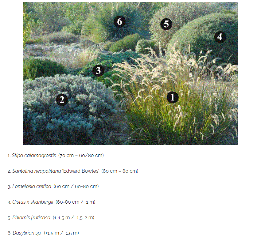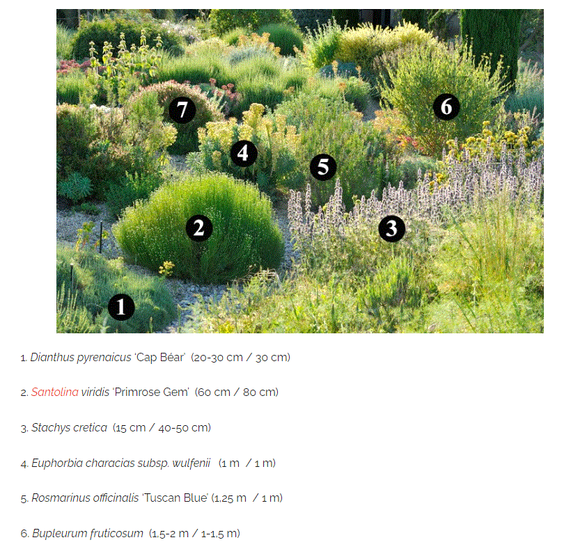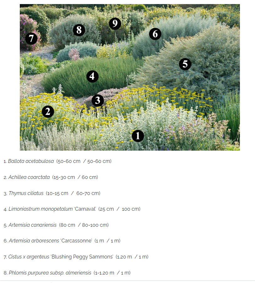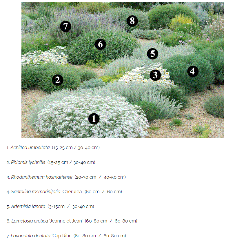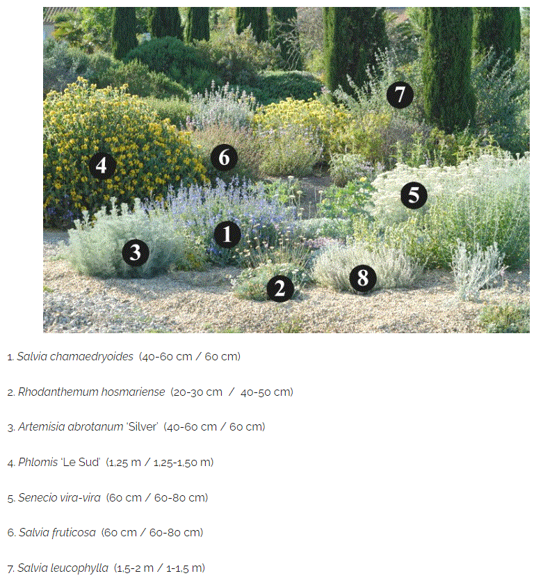 En el catálogo de plantas de Jardin Sec de Oliver Filippi en Méze Francia encontramos muchas plantas seleccionadas durante muchos años de la cuenca mediterránea, cultivadas y adaptadas a este tipo de jardines.