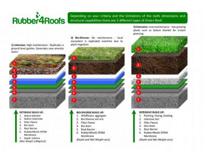 Hay dos tipos principales de cubiertas verdes: extensivas e intensivas. Las membranas cubiertas verdes son adecuadas para ambos tipos de techos:
