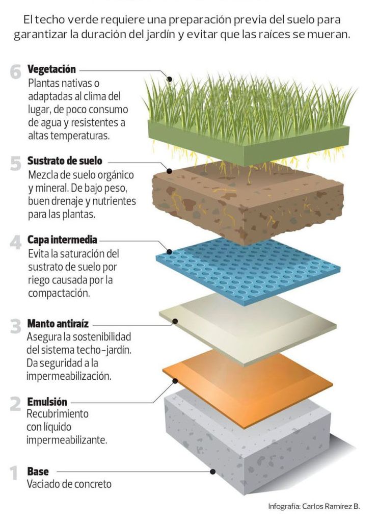 • Proporciona protección contra el calor: ahorra energía con el techo verde que actúa como capa aislante.