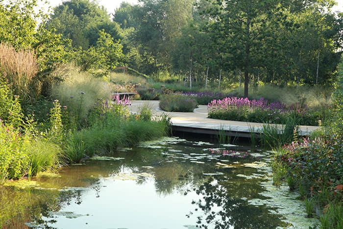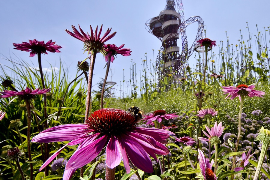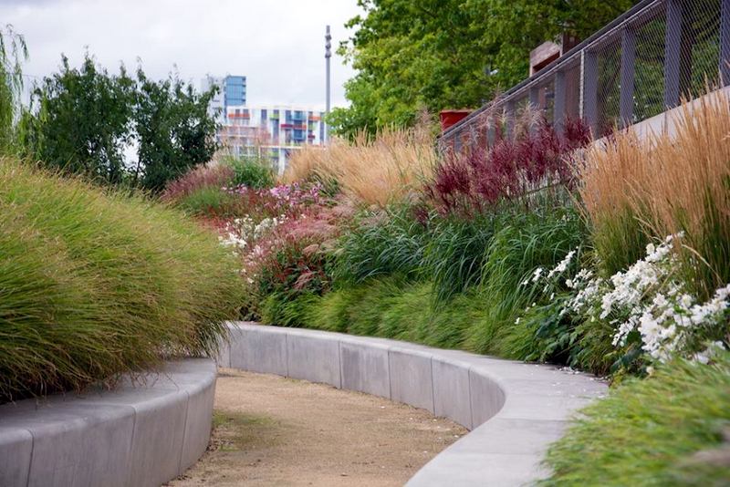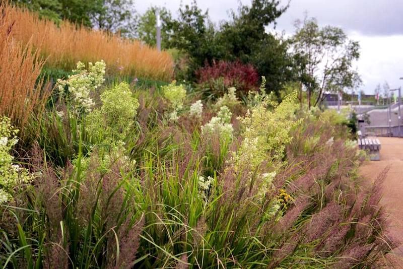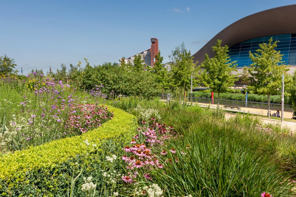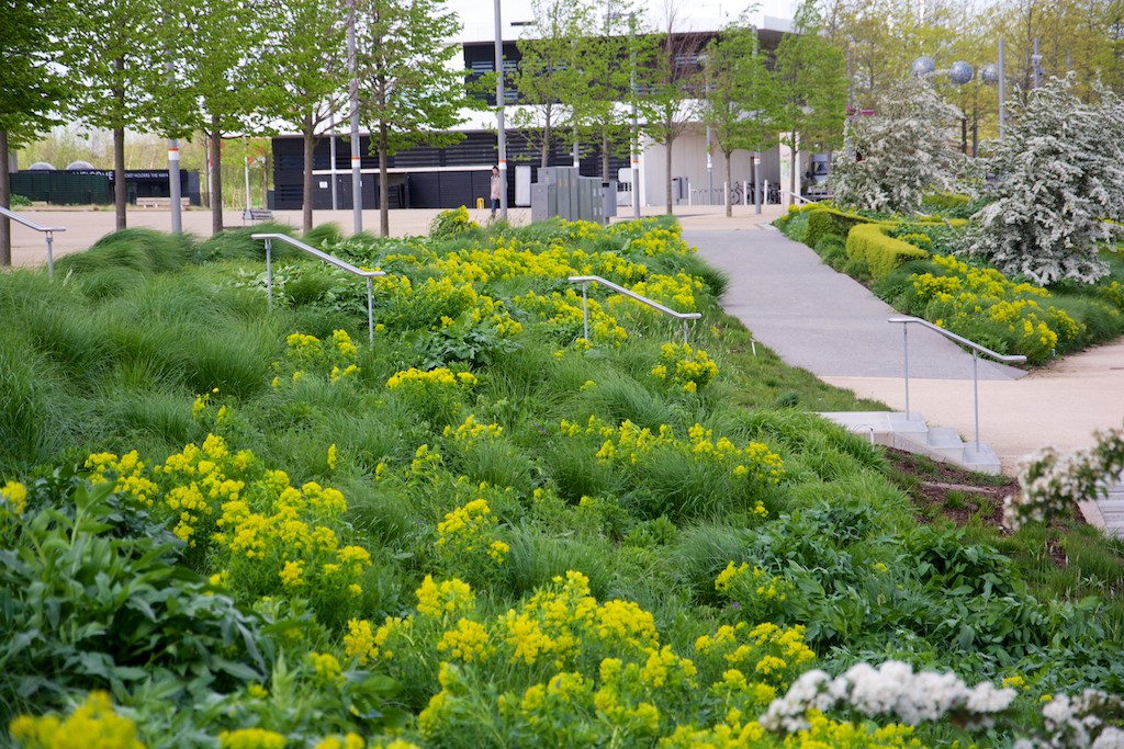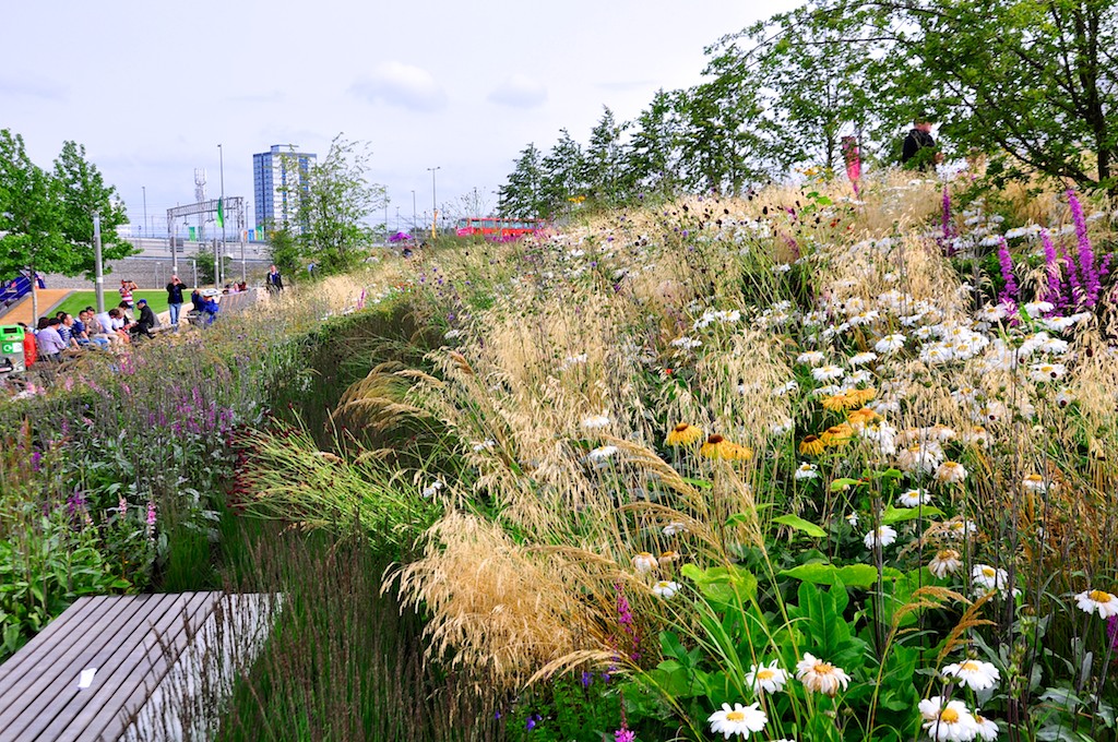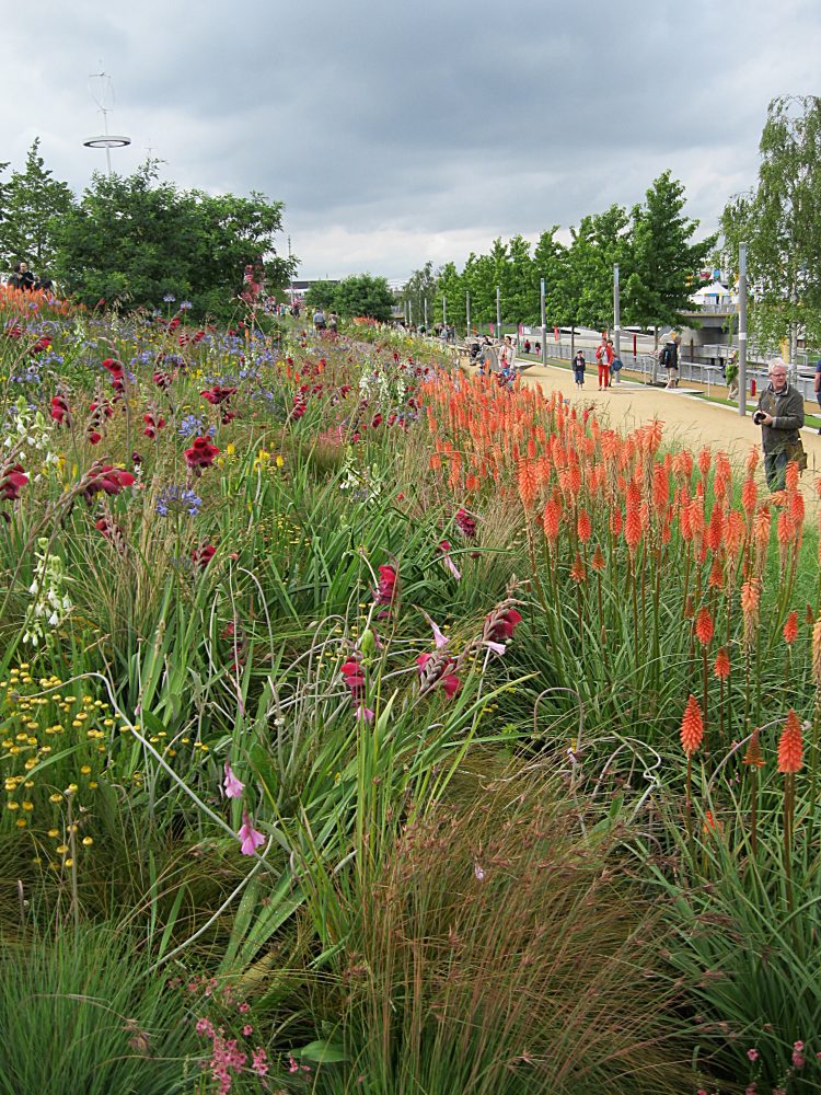 Fue por estas cualidades que la Olympic Delivery Authority, bajo la instrucción del difunto arquitecto paisajista John Hopkins, contrató a los profesores James Hitchmough y Nigel Dunnett de la Universidad de Sheffield, así como a la diseñadora de jardines Sarah Price para formular las extensas plantaciones para las 250 hectáreas. Hitchmough y Dunnett han redefinido la horticultura urbana en los últimos años mediante la creación de comunidades perennes equilibradas: plantaciones densas, parecidas a praderas, que asfixian el suelo, evitan las malas hierbas y requieren menos mantenimiento que los céspedes y los esquemas de los jardines convencionales.