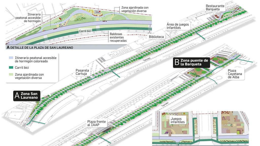 En cuarto lugar habrá dos nuevas plazas en el entorno del Puente de la Barqueta, en los dos espacios colindantes al extremo del puente, que sumarían en total 5.000 m2. En estas áreas se apuesta por la creación de dos grandes zonas ajardinadas con vegetación variada, conservando el arbolado actual que se reforzaría con nueva vegetación y los parterres se rellenarían de vegetación, ahora ausente.