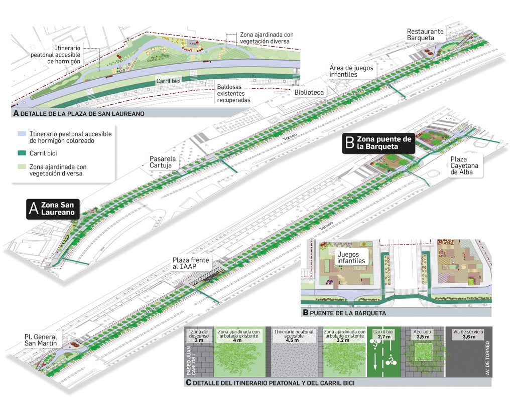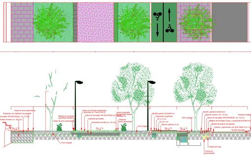 El itinerario peatonal accesible central de 4,5 metros de ancho tendrá una pavimentación continúa franqueado por bandas laterales ajardinadas donde predominará la vegetación autóctona y de baja demanda hídrica además de todo el arbolado existente. Lo que hace suponer que se deprecia toda la pavimentación actual.