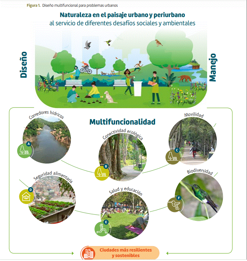 Multifuncionalidad de las SBN: para efectos de este compendio de la guía, es la capacidad para resolver diversos desafíos ambientales y sociales del contexto urbano, por medio del aumento del espacio para la naturaleza, siendo este diseñado y manejado estratégicamente, para favorecer el bienestar humano y la biodiversidad.