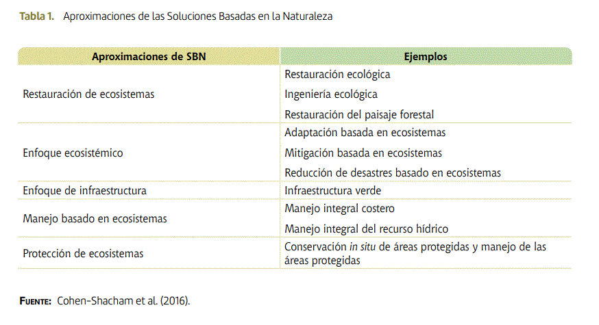 En el contexto urbano, este compendio de actuaciones propone entender la naturaleza en el marco de las SBN como aquellas áreas con coberturas naturales que ya existían antes del desarrollo urbano o que fueron planeadas, diseñadas y/o surgieron espontáneamente y que albergan algún tipo de ecosistema que a nivel urbano pueden ser parques, áreas protegidas ,corredores hídricos y corredores ecológicos, jardines históricos y antejardines de edificios y casas, huertas urbanas, arcenes y arbolado urbano, entre muchas otras tipologías.