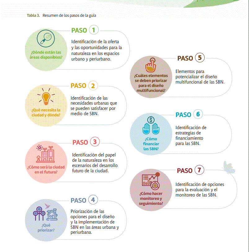 Los pasos que se plantean hacen evidentes los beneficios de la naturaleza en las ciudades, en términos ambientales, reducción del riesgo, mejoramiento de la salud, aumento de la calidad de vida, entre otros. Estos beneficios se integran de forma estratégica y planificada, favoreciendo la resiliencia y el bienestar humano.