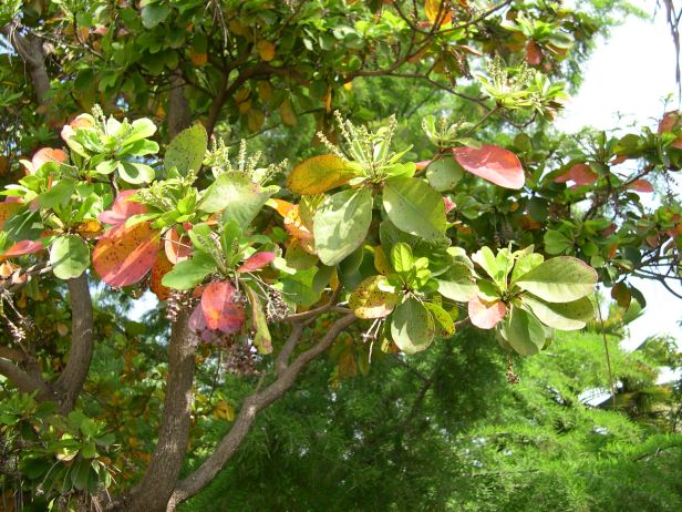 Aunque las hojas son básicamente verdes, no es poco común que en las hojas tiernas estén protegidas por «antocianina» que las hace aparecer rojas o púrpura.