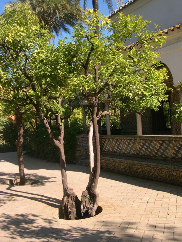 En la jardineria arabe además del olivo (Olea europaea), el almez (Celtis australis), la encina (Quercus ilex), el laurel (Laurus nobilis), así como el algarrobo (Ceratonia siliqua), eran plantas habituales en sus jardines junto con otras el fresno (Fraxinus angustifolia), el álamo blanco (Populus alba), el chopo (Populus nigra), junto con los almendros (Prunus dulcis), perales (Pyrus communis), manzanos (Malus communis) y el ciruelo (Prunus doméstica).
