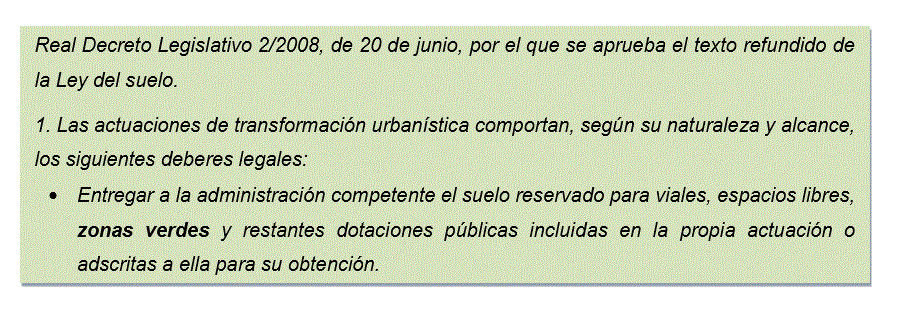 La importancia de los parques y jardines para la garantía de la calidad de vida en los entornos urbanos ha quedado recogida en la legislación, tanto a través de la consideración de estos servicios como competencias de los entes locales, como a través de la normativa en materia de suelo y urbanismo, donde se establece la obligatoriedad de reservar espacios para esta tipología de zonas.