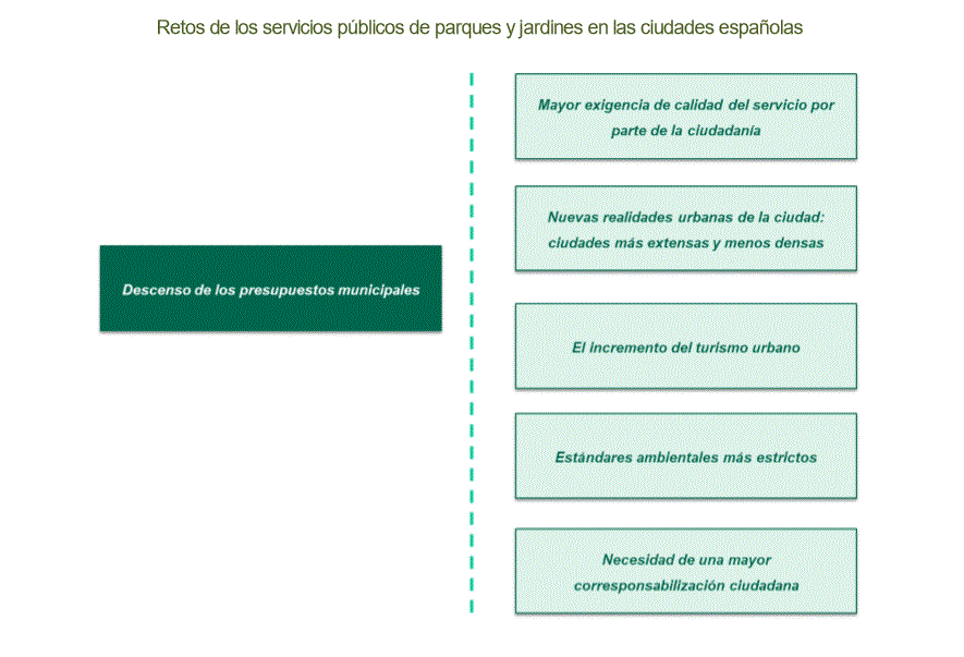 Los retos actuales asociados a la definición de los servicios de diseño, construcción y mantenimiento de los parques y jardines municipales coinciden, por un lado, con el contexto económico actual de descenso de los presupuestos municipales y, por otro, con la necesidad de actualizar los servicios en base a las nuevas realidades territoriales y sociales de las ciudades españolas, que en muchos casos precisan de un incremento de los recursos destinados a los mismos