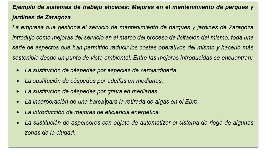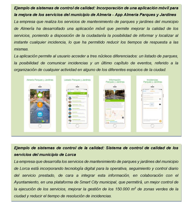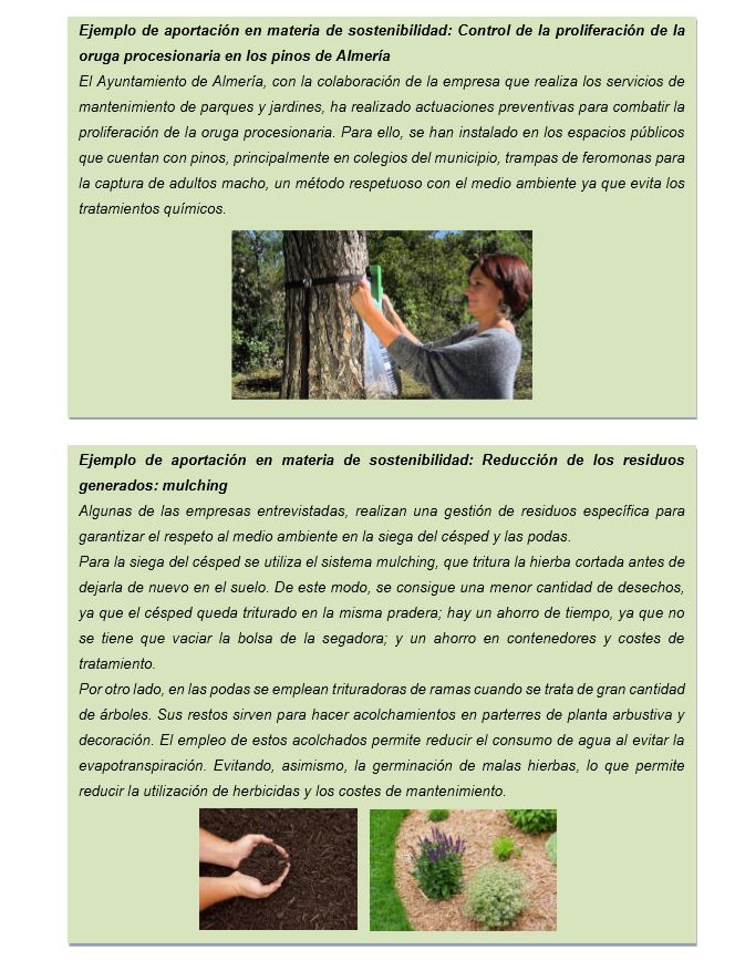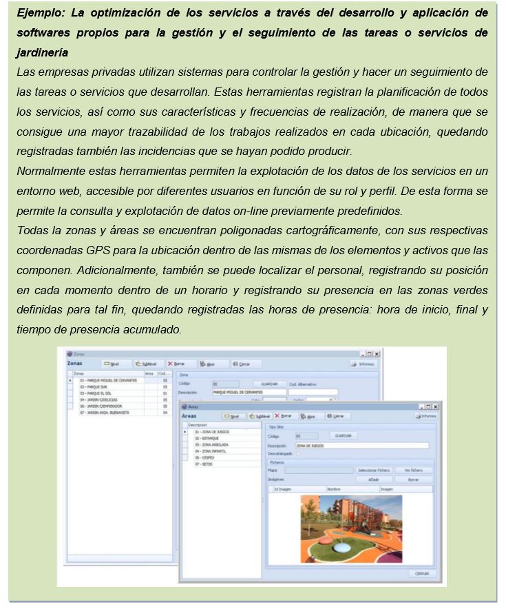 El grado de especialización de las empresas privadas les permite proponer a sus clientes aquellos sistemas de trabajo más eficaces para cada tipología de zona verde (sistemas de riego más adecuados, técnicas de conservación más idóneas para cada especie, sistemas de control de plagas específicos para un determinado parásito, etc.), impulsar la optimización de los servicios, desarrollar sistemas de control de la calidad e implementar servicios sostenibles desde un punto de vista ambiental.
