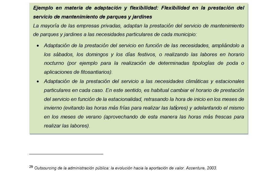 Habitualmente, los costes laborales cuando los servicios de jardinería son realizados por una entidad privada son menores que en caso de realización directa de los servicios por parte de la entidad local (ya sea directamente desde el Ayuntamiento o desde una empresa pública). El menor coste asociado a la gestión privada se debe, en buena medida, a que las empresas privadas disponen de equipos de gestión de personal con una mayor experiencia en la negociación de los convenios colectivos de estos servicios.