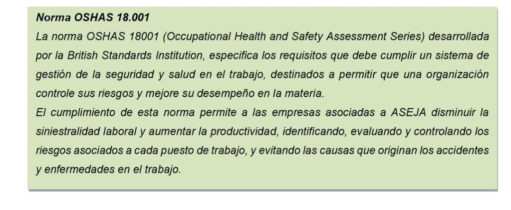 Para el cumplimiento de estos objetivos, las empresas asociadas a ASEJA disponen de departamentos específicos en materia de riesgos laborales con profesionales especializados en las diferentes técnicas de prevención (seguridad en el trabajo, higiene industrial y ergonomía y psicosociología aplicada), tanto en los servicios centrales de prevención, como en los diferentes municipios donde operan. La labor de estos profesionales se complementa, asimismo, con la colaboración de profesionales externos.