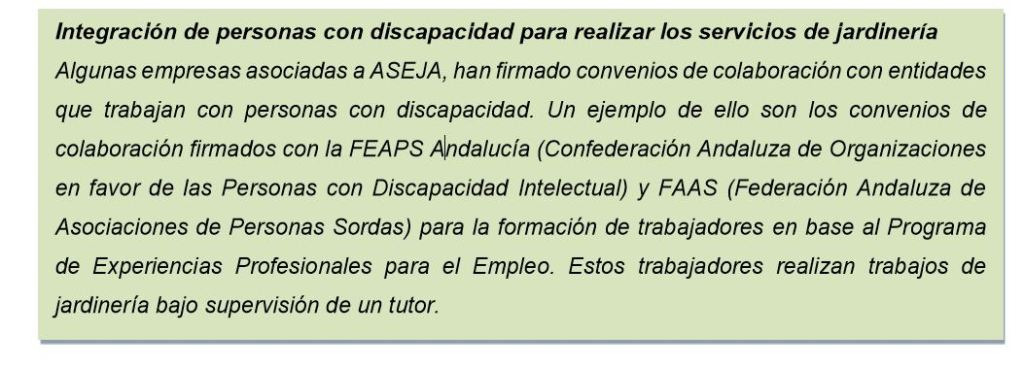 Las empresas del sector privado de jardinería impulsan la inserción laboral de colectivos con dificultades de integración en el mercado de trabajo, para lo que colaboran activamente con asociaciones, empresas y fundaciones de inserción, así como con los servicios sociales de los propios Ayuntamientos donde operan