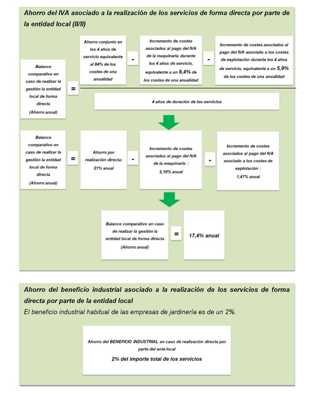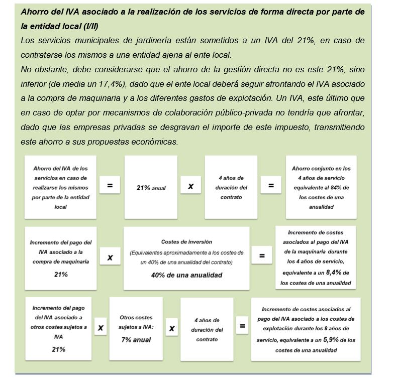 La realización de los servicios de mantenimiento de parques y jardines de forma directa por las entidades locales permite ahorrarse el IVA y el beneficio industrial asociado al empleo de mecanismos de colaboración público-privada. Sin embargo, este ahorro se ve superado por el incremento de costes asociados a otros aspectos, incremento que se produce al no poder accederse a las ventajas económicas asociadas a la colaboración público-privada