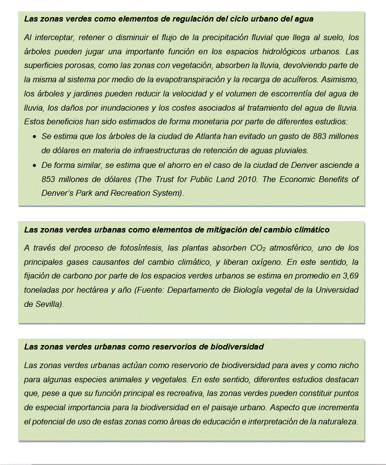 Las zonas verdes urbanas permiten una mejora de la calidad del aire de las ciudades, son elementos de mitigación del cambio climático, regulan la temperatura de los espacios urbanos, y el ciclo del agua urbano, siendo, asimismo, elementos mitigadores de la contaminación acústica, y configurándose como reservorios de biodiversidad.