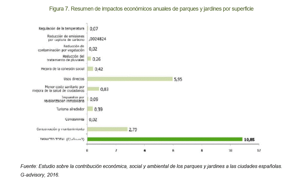 Los impactos económicos positivos de estas zonas pueden ascender, según el Estudio sobre la contribución económica, social y ambiental de los parques y jardines de las ciudades españolas, a casi 11 €/m2 y año, es decir, 4 veces el coste que supone para los municipios su conservación.