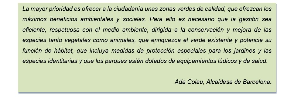 Los parques y jardines tienen un grado de importancia muy elevado, ya que en muchos casos son el único o el más próximo contacto de los ciudadanos con la naturaleza. Son espacios de relax, de confort, de bienestar, de salud, de socialización… Ada Colau, Alcaldesa de Barcelona