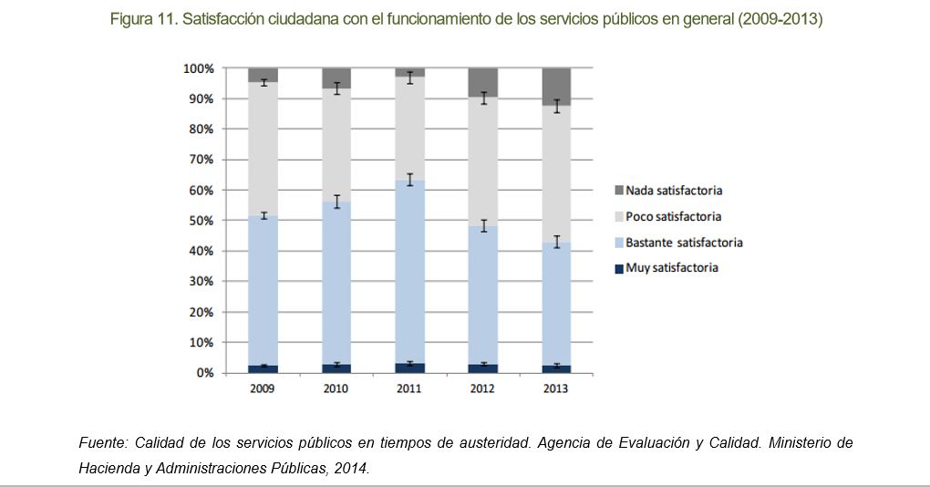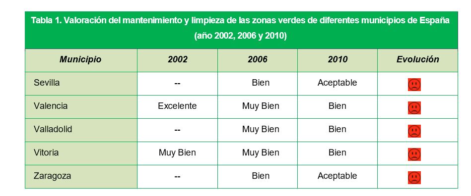 En las últimas décadas, hasta la llegada de la crisis económica, se produjo un incremento de la cantidad de zonas verdes presente en los municipios españoles, así como de la calidad de los servicios de mantenimiento y conservación de estas y, en consecuencia, del grado de satisfacción de los ciudadanos respecto a estos servicios. Así lo reflejan diferentes informes relativos a la evolución de la satisfacción ciudadana respecto a los servicios de jardinería, como por ejemplo los análisis realizados por la Agencia de Evaluación y Calidad del Ministerio de Hacienda y Administraciones Públicas, donde el 65,2% de los ciudadanos en 2011 se mostraban satisfechos con los servicios de jardinería (11,1% muy satisfechos y 54,1% bastante satisfechos).