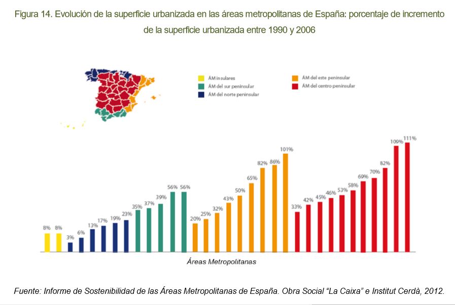 La población española se vio incrementada entre 1990 y 2010, concentrándose este incremento poblacional principalmente en los núcleos urbanos. En paralelo, se produjo un incremento, todavía mayor, de la superficie urbana de las ciudades españolas. Como resultado de ambos aspectos las ciudades son más grandes y con un urbanismo más disperso que hace 20 años.