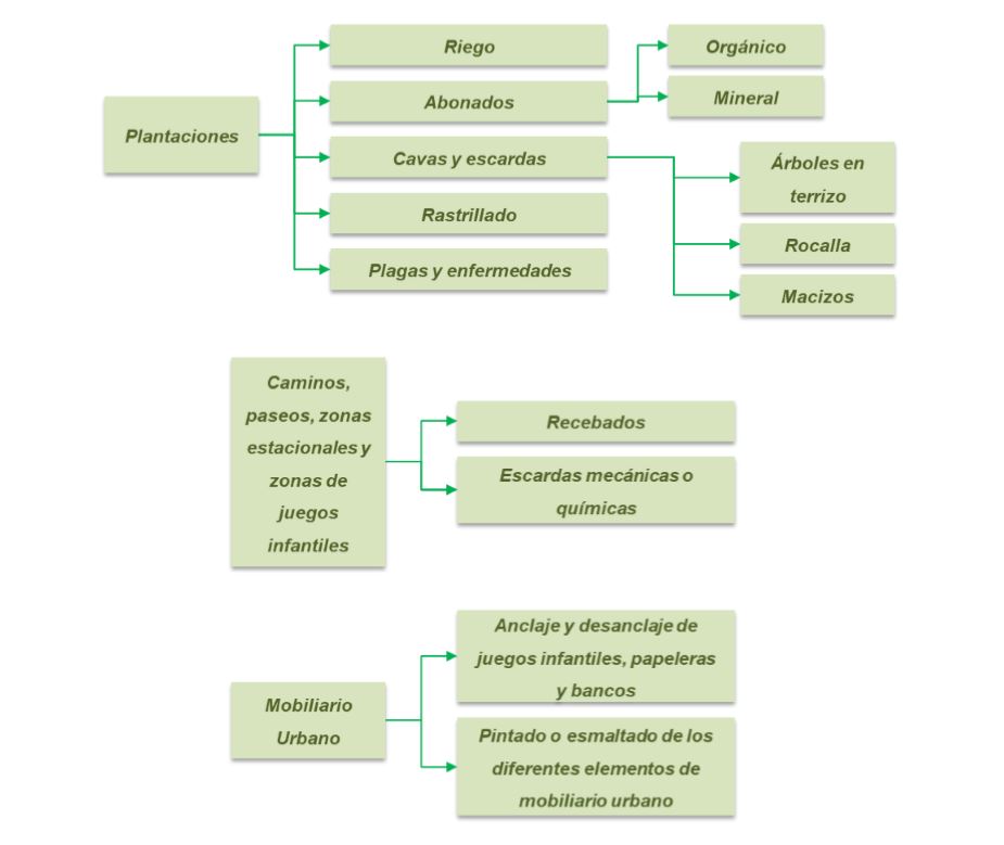 Los servicios de mantenimiento de parques y jardines, dada la especificidad de las diferentes tipologías de especies, requieren de personal especializado para la realización de los diferentes trabajos (dado que en caso contrario se corre el riesgo de muerte de la vegetación mantenida, lo que obligará a su reposición).