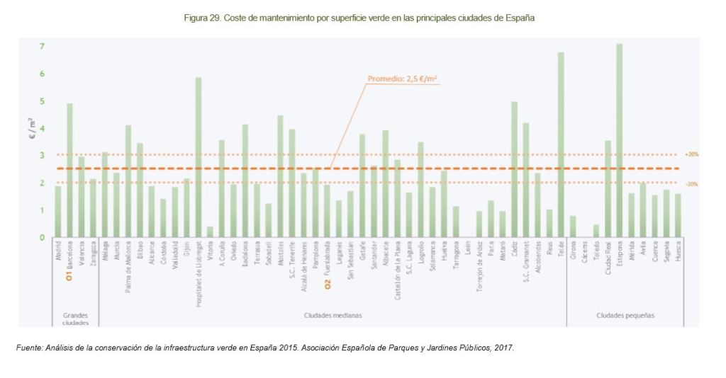 La importancia de estos espacios se ve reflejada, a su vez, en los presupuestos municipales. Así, las principales ciudades españolas destinan en promedio un 2,7% de sus presupuestos municipales a estos espacios, aspecto que se traduce en un gasto promedio de 26,8 euros por habitante y año en estos espacios. No obstante, si en lugar de considerar únicamente las grandes ciudades, se tienen en cuenta la totalidad de municipios españoles analizados por el Ministerio de Hacienda y Administraciones Públicas, los recursos destinados a la creación y mantenimiento de zonas verdes se reducen a un 1,5% de los presupuestos municipales3.