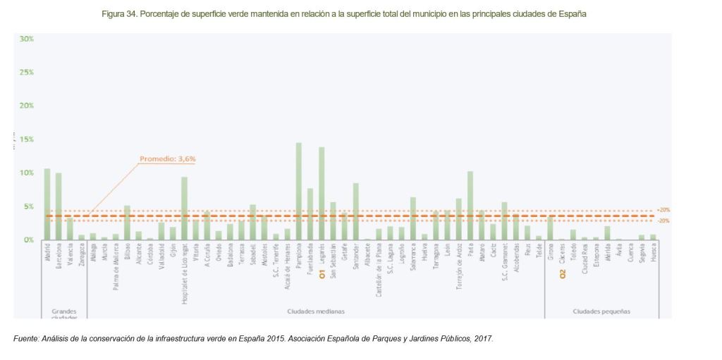 El desarrollo y mantenimiento de las zonas verdes urbanas, dada su relevancia para la calidad de vida de los ciudadanos, ha sido uno de los principales ejes de las políticas municipales desde la llegada de los Ayuntamientos democráticos. En este sentido, algunas ciudades españolas ya han alcanzado ratios y niveles de conservación equivalentes a los de otras ciudades europeas significativas de nuestro entorno europeo. Como media nacional se dispone de 15 m2/habitante de espacios verdes(7,4 m2 son de zonas verdes y 7,9 corresponden a áreas forestales de mantenimiento más naturalizado4).