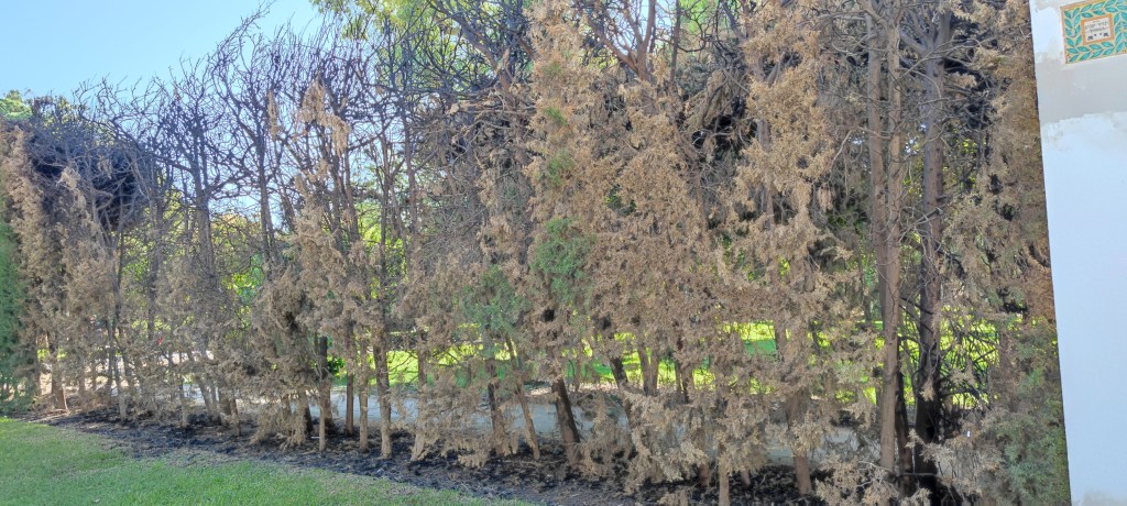 No fue hasta ayer que pude comprobar in situ los daños ocasionados por los incendios que afectaron principalmente a los setos de cipreses, un hecho vandálico condenable de un pirómano descontrolado que ojalá lo identifique la Policía para que no siga incendiando.