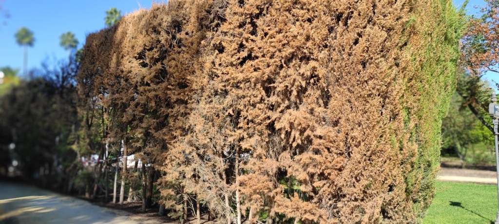 Los daños han sido importantes pero remediables, nos toca arrancar todos lo cipreses quemados y no quemados retirando las raíces y tierras existentes y empezar de nuevo con aportación de sustrato adecuado, apertura de zanjas para la nueva plantación, elegir el suministro de plantas de ciprés sanas y bien cultivadas para la formación de los nuevos setos, entutorado de los setos dobles y recorte a la misma altura que los accidentados, plantas hay en el mercado para una perfecta restauración.