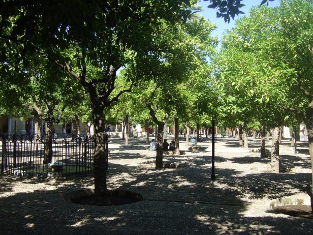 Tanto los olivos como los naranjos conforman con sus troncos alineaciones que se prolongan visualmente con las líneas de los fustes de las columnas, logrando un efecto óptico, unas cadencias rítmicas interna-externa, visibles en la Edad Media, espacios contrastados de luz y de sombra, con el espectáculo de los arcos dobles de formas ondulantes, las 113 lámparas y los candelabros de azófar, latón y vidrio encendidos en permanencia, con un total de 20.000 luces. Los primitivos olivos darían una cosecha aumentada por las limosnas de los creyentes para esa temblorosa luminosidad de ardiente fervor. Los naranjos aportaron más sombra y el perfume de sus flores.