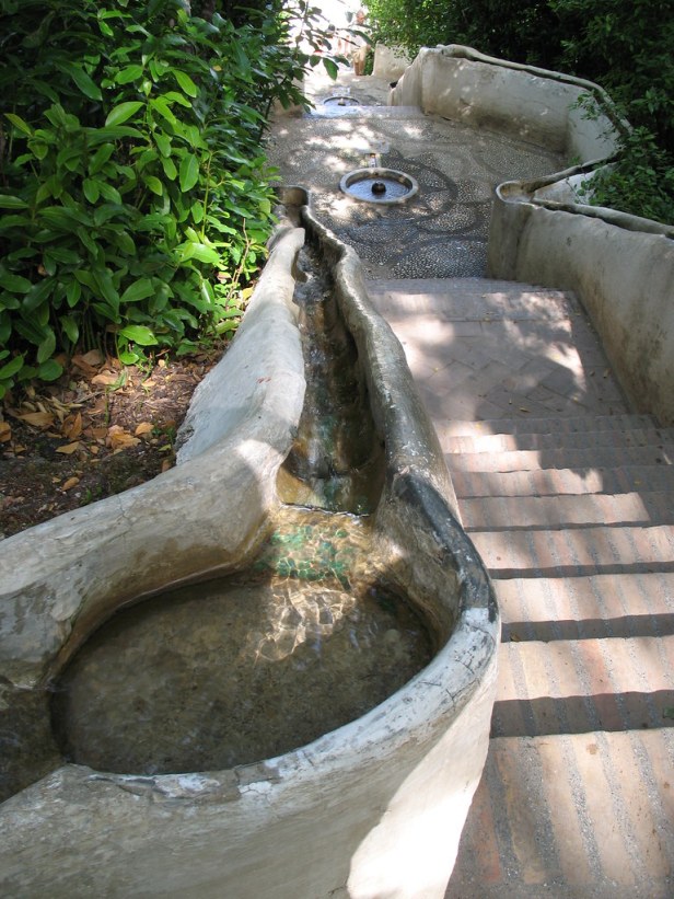 Fuesen los doce leones signo de las horas, como se dice, pudo ser una clepsidra, la fuente con caída de agua por el león adecuado a la hora, o no; de las fauces de los leones, «babea el agua», como es sabido, gracias a los buenos traductores, sin saltar, ni salpicar, como se ha dicho en otros tiempos, y corre luego por los canalillos, o acequias, dividiendo el jardín en cuatro partes.