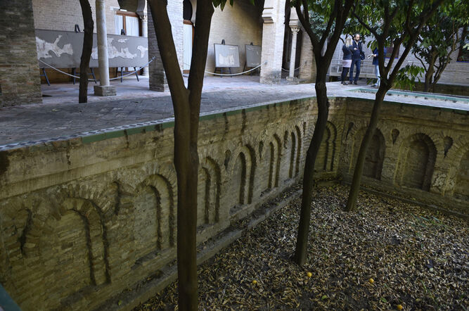 Jardín recientemente excavado y sacado a la luz, desde el siglo XVI, en que se solo, para gloria del arte de España. La estupenda restauración acometida bajo la dirección del arquitecto Rafael Manzano, de excavar el jardín rehundido perteneciente al palacio de Al Mutamid, luego correspondiente a la zona del R. A. conocida desde los RR. CC., como Casa de la Contratación, devolvió este jardín al patrimonio de España, para su conocimiento y contemplación.