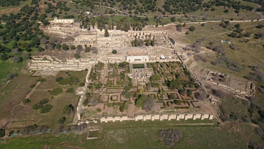 Espacio de Producción: Alquerías y Almunias. Siempre murados, relacionados con edificación, sus estructuras son de predominio regular, planta rectangular y niveles abancalados. Son importantes ejemplos y muestras existentes, los de Zaragoza, Toledo, Valencia, Mallorca, Málaga, y sobre todo los de Córdoba, Sevilla y Granada. Es sabido, pero importa seguir repitiéndolo, que España tiene en el s. XXI, el jardín más antiguo de Europa, en uso público ininterrumpido desde el s. VIII, sin cambios sustanciales en sus valores tangibles o intangibles, situado en la mezquita de Córdoba Que construye Abderramán I, después de comprar una iglesia cristiana que ocupaba el sitio de un templo hispano romano. El «sahn», está separado de la calle por muros. En tres de sus lados, con paseadero cubierto y galería arqueada, el cuarto lateral longitudinal, está limitado por la fachada de paso a la mezquita, con la que forma un todo. El «sahn», es el espacio a cielo abierto para prepararse a la oración y efectuar las preceptivas abluciones purificatorias para el rezo. La planta general inspirada en los templos judíos es rectangular, el sahn tiene cuatro puertas y un alminar para los cinco cantos a lo largo del día. La plantación se estableció a marco real para facilitar el fluir del agua, por la retícula de sus acequias sobre el primitivo suelo de azulejos, hoy de guijarros.