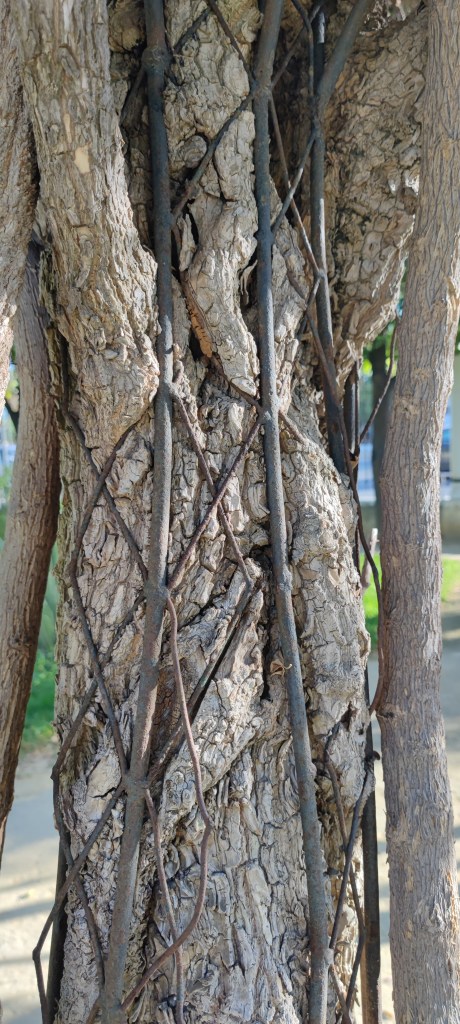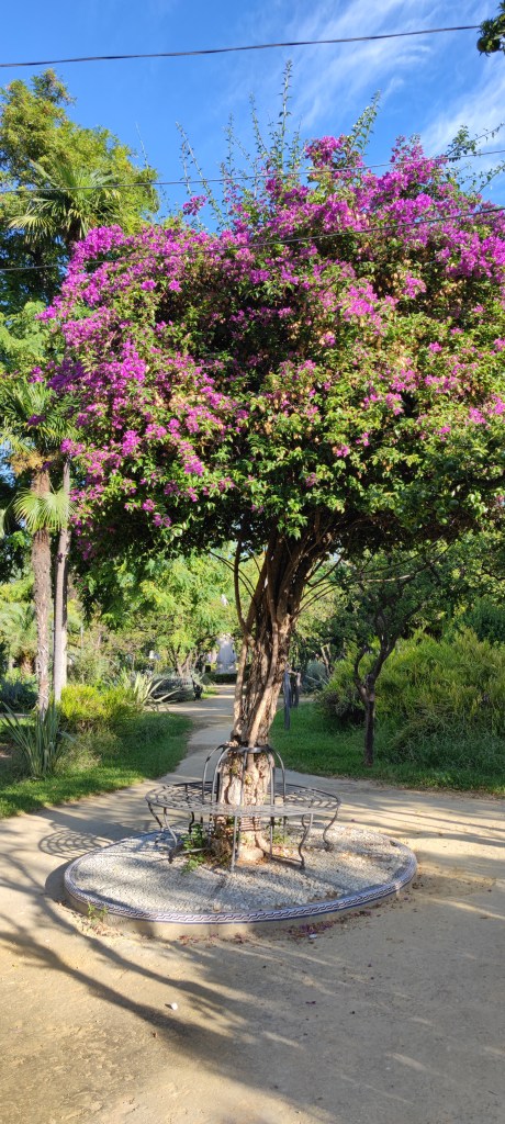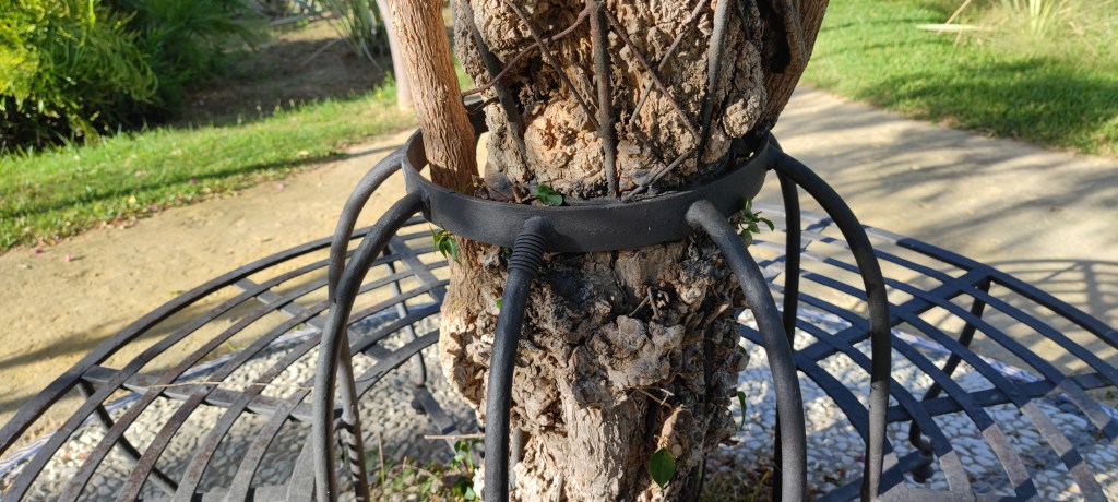 Estremecedora lucha a través de los años entre una Bouganvilla glabra var. sanderiana y el elemento metálico en forma de paraguas y banco que la sustenta ,introducidos los hierros en su tronco esta trata de sobrevivir a pesar de los muchos estrangulamientos que años tras años le ocasiona su porteador´. Un difícil problema que solucionar antes que por el peso que producen sus ramas caiga abatida por una ráfaga de viento.