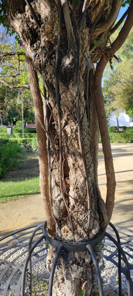 El banco ya esta levantado del suelo por el peso e inclinación que manifiesta la planta. El jardinero debe intervenir en la lucha poniendo a salvo la planta y garantizando que no existe riesgo de desplome. Fotos de los años anteriores nos la muestran como elemento decorativo de los jardines. Las actuales como un riesgo de desplome por fallo de los elementos metálicos que la sostienen