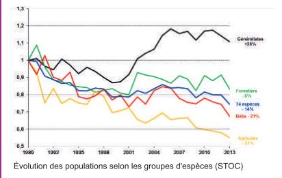 El conocimiento de la biodiversidad local y el estudio de su dinámica han comenzado recientemente. A finales de la década de 1980, el Muséum National d’Histoire Naturelle lanzó un programa para mejorar nuestro conocimiento de las especies de aves comunes. Se trata de la Monitorización Temporal de Aves Comunes (STOC) cuyo protocolo estandarizado, destinado a ornitólogos, se realiza en todo el territorio y permite un seguimiento . Se monitorean 175 especies y se analizan 4 grupos de especies que indican hábitats: especies generalistas y aquellas especializadas en ambientes forestales, agrícola y construido. Surge la observación de una erosión global de las poblaciones para especies especializadas (excepto para especies de afinidad forestal), pero de un aumento para las especies generalistas. También observamos que las especies relacionadas con los edificios también están disminuyendo a pesar del aumento de las áreas urbanizadas. Finalmente, otros estudios muestran que, en un gradiente desde fuera de las ciudades hasta el centro, el número de especies tiende a disminuir, mientras que el número de individuos de un la misma especie está aumentando.