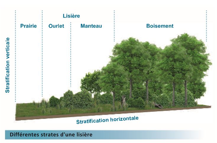Los estratos de la maleza se desarrollan más o menos de acuerdo con dos factores principales: la disponibilidad de luz por un lado y la frecuencia y la intensidad de las perturbaciones por otro lado (salir por juego, algo inesperado , pisoteo,etc…). En los espacios urbanos, la mayor perturbación sigue siendo la frecuentación por el hombre cuyo pisoteo puede destruir gran parte de la vegetación y compactar fuertemente el suelo. Por lo tanto, para promover el desarrollo de los diferentes subestratos, es necesario controlar estos dos parámetros. Cuanto más se abra el dosel (tala selectiva de árboles),más estratos herbáceos y arbustivos se verán favorecidos en detrimento de los muscinales. Si queremos promocionar un estrato arbustivo, es necesario durante varios años limitar la asistencia del sector, o incluso ponerlo en defensa. , y para promover arbustos al ahorrarlos durante la siega si es necesario. Los bordes son espacios muy ricos donde los estratos herbáceos y arbustivo están bien representados. Permitir que esta vegetación de ecotonos crezca puede ser una solución fácil de implementar para aumentar la biodiversidad.