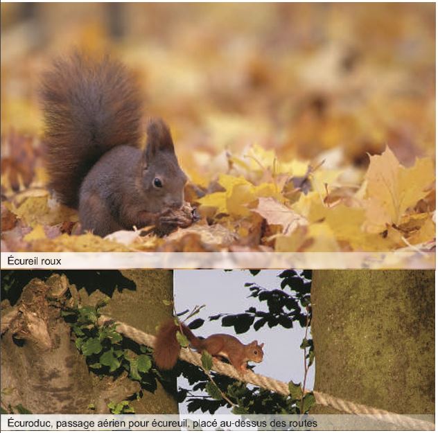 Para limitar el riesgo de accidentes, se recomienda instalar enlaces aéreos entre parques urbanos. Estos «pasajes de ardilla», también llamados ardillas, son sistemas de cuerdas que se extienden por encima de los carriles de tráfico. Este sistema ya se ha instalado en muchas regiones de Francia. Por lo tanto, las ardillas se han colocado en el departamento de Ródano, en particular como parte de la realización del proyecto de vía verde que une los distritos 5 y 9 de Lyon y Tassin. Además, podemos proponer para el período invernal arreglos de cavidades artificiales (cabañas)y comederos tipo dispensador de avellanas.