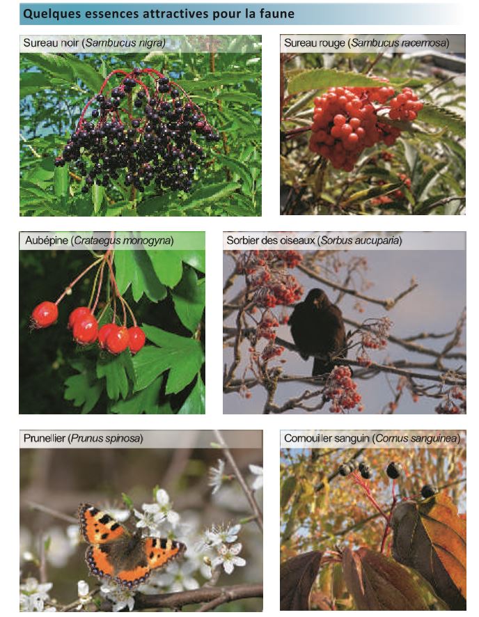 La vegetación en la ciudad tiene una función importante para la vida silvestre, tanto en términos de protección (refugio contra depredadores, sitio de anidación, protección contra el mal tiempo, así como de recursos alimenticios. Este último punto se puede mejorar plantando especies cuidadosamente elegidas que pueden producir néctar, polen, semillas y bayas para la vida silvestre. La diversidad faunística es mucho más fácil de establecer cuando las especies de plantas ofrecen variedad en los recursos alimenticios y un período escalonado de producción de flores y frutas. Los setos, las plantaciones de árboles y arbustos en alineación se integran fácilmente en el tejido urbano y pueden ser muy atractivos para la vida silvestre, siempre que no sea un «muro verde» monoespecífico y luego, a menudo, desprovisto de vida.