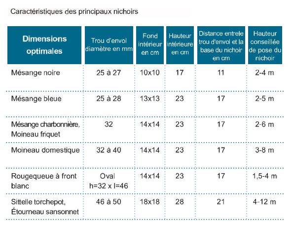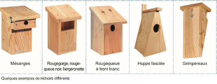 Durante la temporada de reproducción, cada especie de ave tiene su propio comportamiento y hábitos. Existen muchos modelos de cajas nido adaptadas a cada una de las especies. Algunos son comunes, como los destinados a polluelos, petirrojos, trepadores y trogloditas. Otros, más particularmente, son adecuados para especies en peligro de extinción como las golondrinas. Finalmente, otras cajas nido son más específicas, pero también más inciertas en cuanto a su ocupación: estas son las cajas nido para búhos, lechuzas, campanarios, cernícalos, etc… La colocación de estos refugios requiere un buen conocimiento de la especie y una instalación incorrecta podría resultar más perjudicial que útil para las aves.